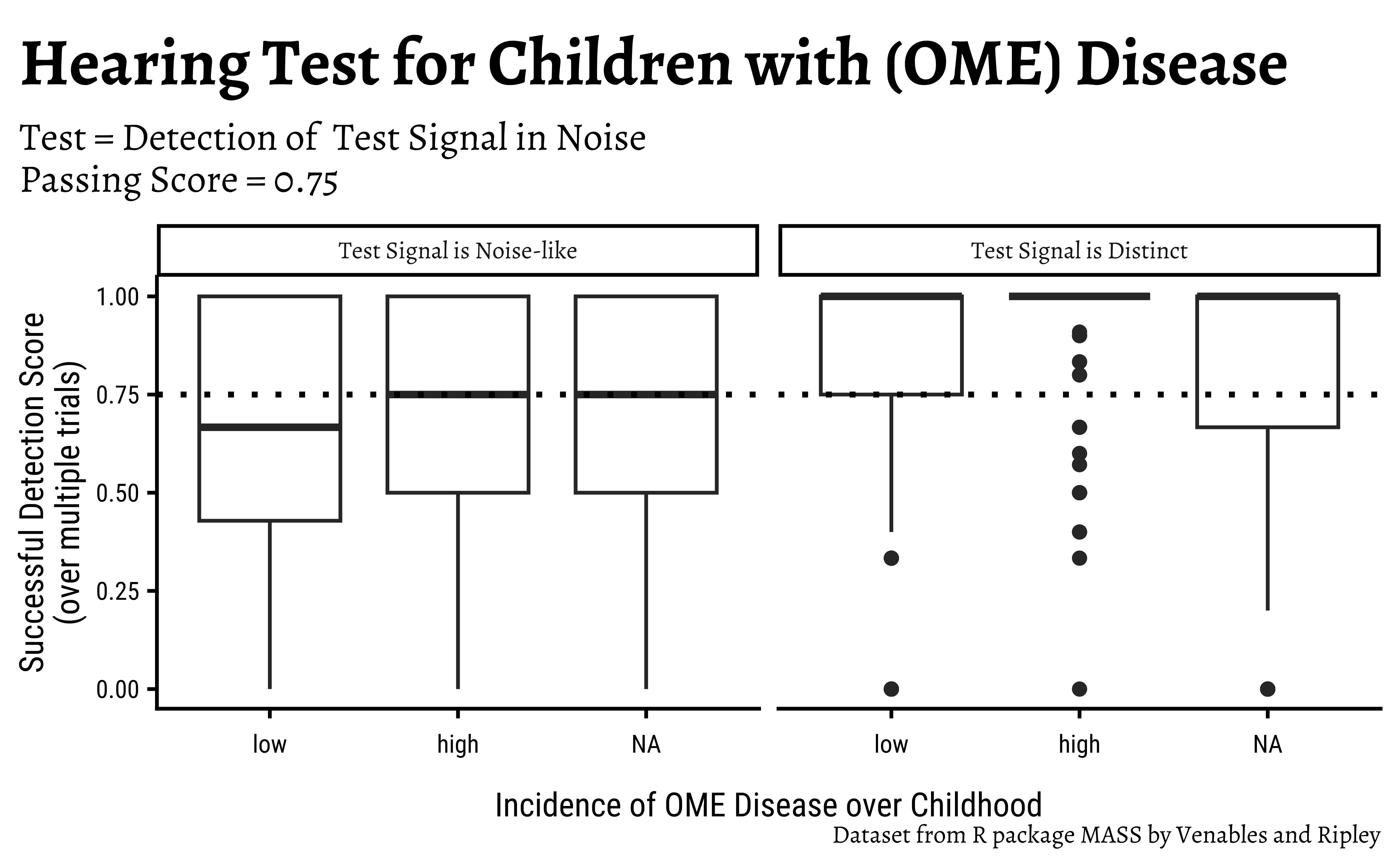 Children are monitored for OME (Otitis Media with Effusion, i.e. fluid in the middle ear) over time. It is believed that they later ( i.e. during aduldhood) suffer from “binaural hearing loss” (detecting sound amplitude and direction) after past episodes of OME during their childhood. The hearing-test is conducted multiple times, with a Test Signal embedded in noise played over audio loudspeakers. One loudspeaker has only Noise, and the other loudspeaker has the Test Signal in Noise. There are also two types of Test Signals: one is like noise itself and the other is distinct. In any test round, children are expected to orient themselves towards the appropriate loudspeaker and detect the presence of the Test Signal at varying levels of volume, with a passing success rate of 75% over multiple tests.